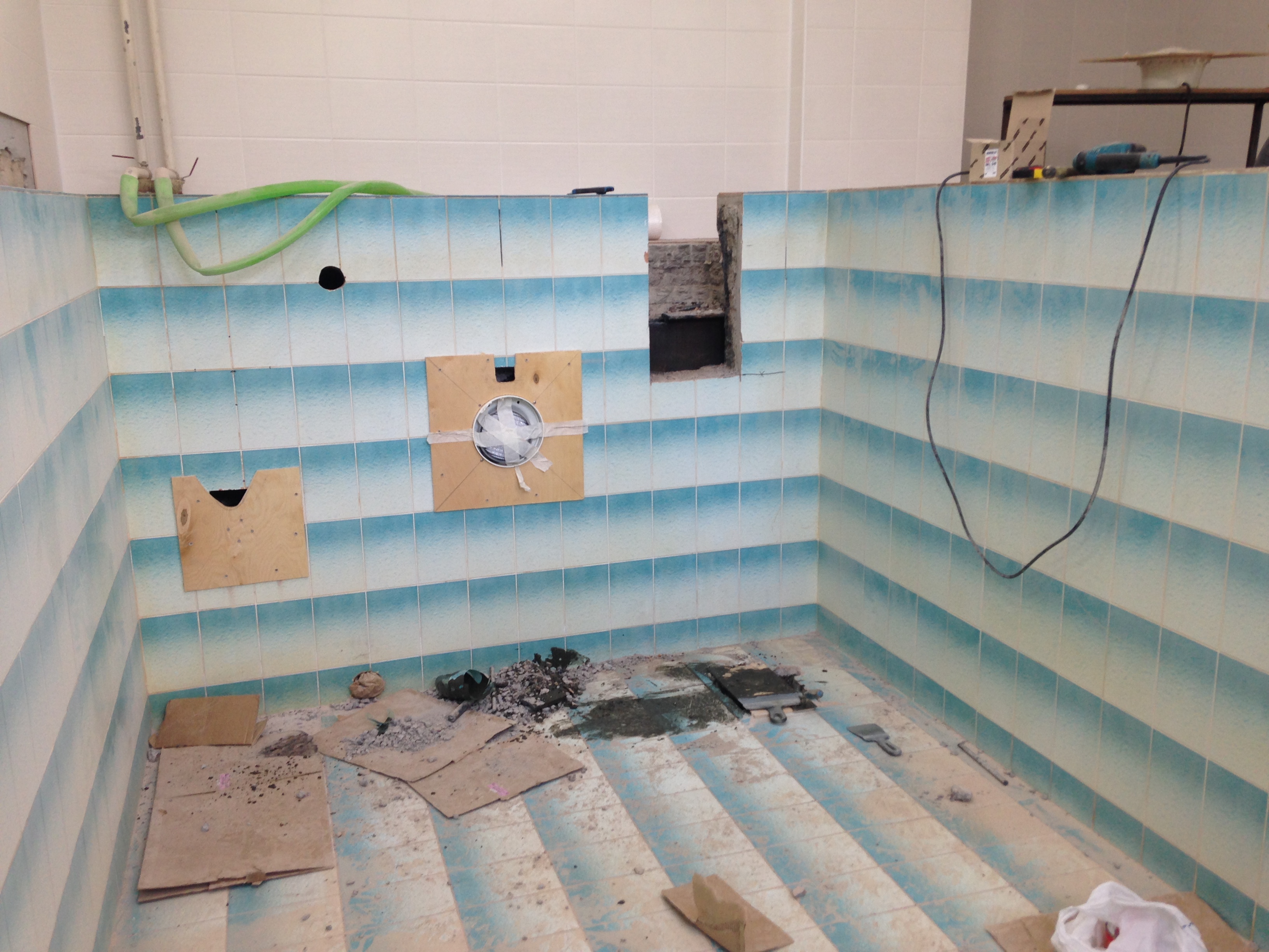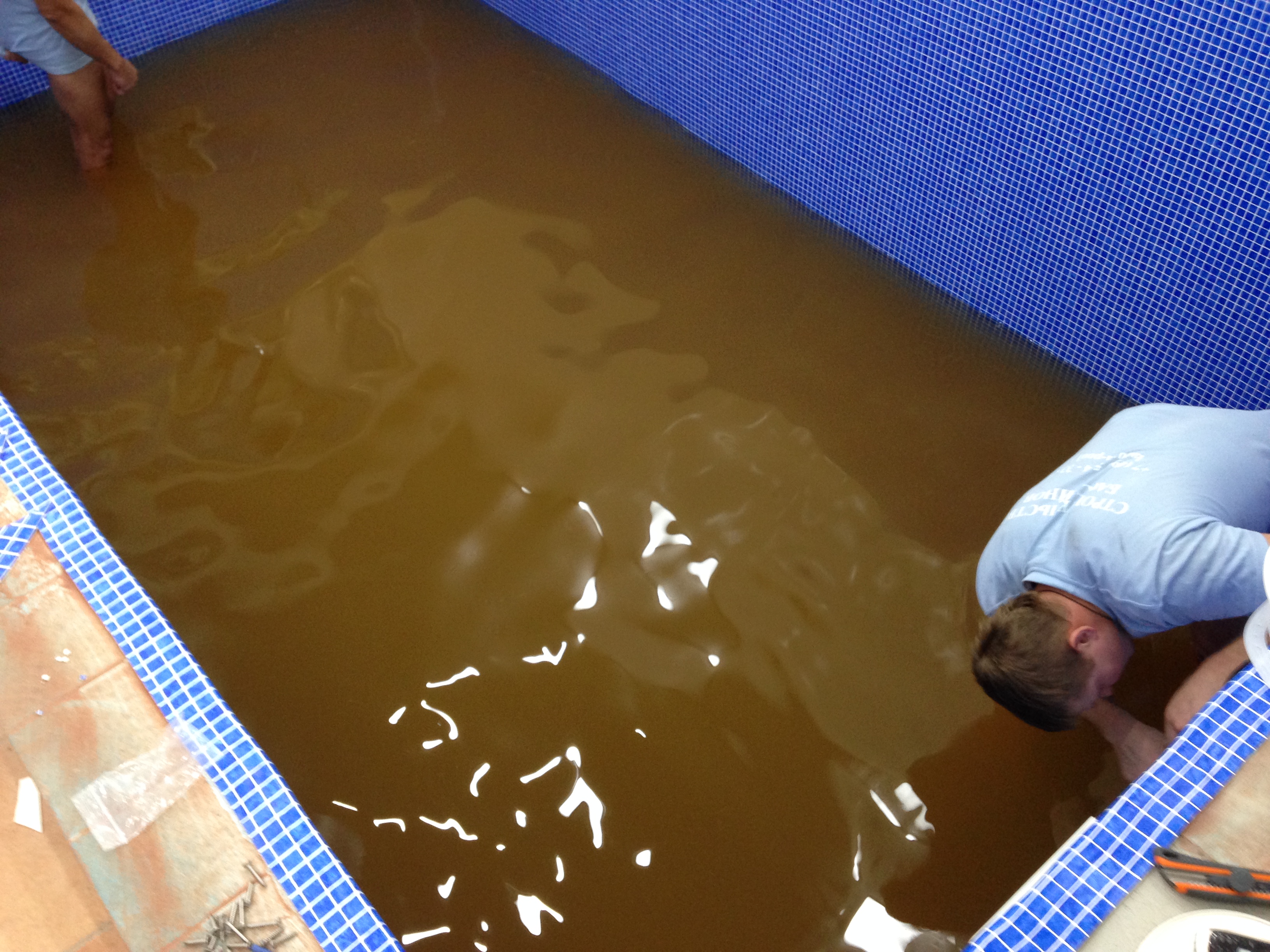 Проверили качество плитки, простучали везде, решили плитку не сбивать, а облицовывать пленкой ПВХ прямо по плитке. Технология позволяет. В чаше конечно отсутствовали технологические отверстия, пришлось продалбливать. Да, размеры бассейна были 4*2,6 и глубиной 1,6 м. Кстати, данной технологией можно пользоваться, если плитка нигде не бухтит и не отваливается.